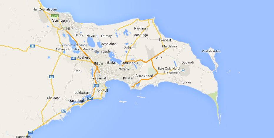 Baku is located on the left coast of the Caspian Sea. The region where the city is located is Absheron, which is the peninsula that you see in the map.